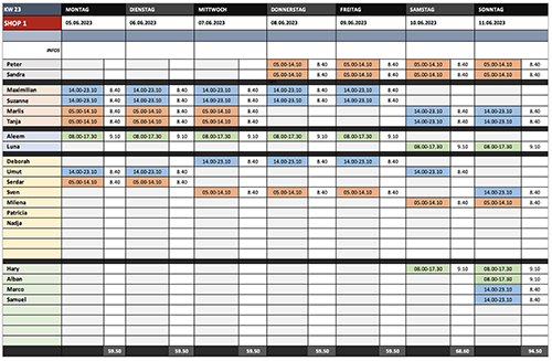 Der Onlineplan basiert auf Excel, kann einfach bedient- und in Sekunden hochgeladen werden. Immer aktuell, auch bei kurzfristigen Änderungen in der Planung. Nie wieder Arbeitspläne ausdrucken, nie wieder Doppelbesetzungen oder fehlende Mitarbeiter in den Schichten.